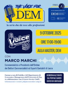 Il 9 Ottobre 2025 dalle 17 alle 19 in Aula Master presso il Dipartimento di Economia e Management si terrà un incontro con Marco Marchi, presidente dell’Ordine dei Dottori Commercialisti e degli esperti contabili di Lucca.